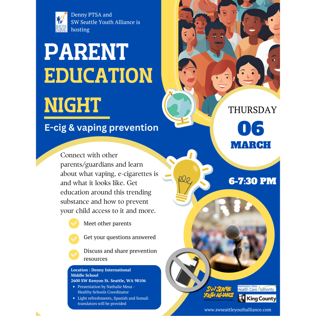 Please join us tonight for Parent Education Night. We will be presenting on E-Cigarettes and Vaping prevention for youth. Light snacks will be available. 6-8pm at DIMS 2601 SW Kenyon St. Seattle, WA 98106